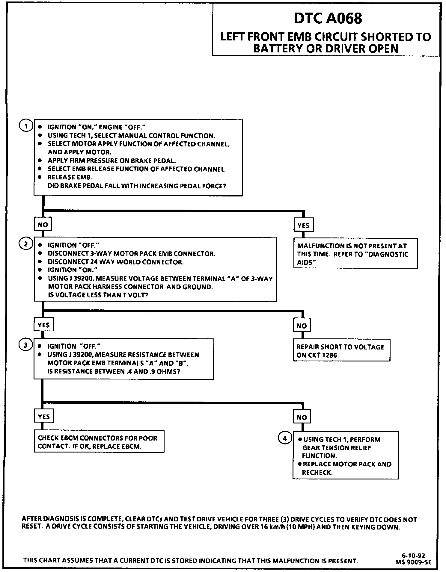 DTC A068 can be set only when the left front EMB is commanded "ON" (released). If an excessive voltage drop is across the motor driver for the left front EMB, a malfunction exists.