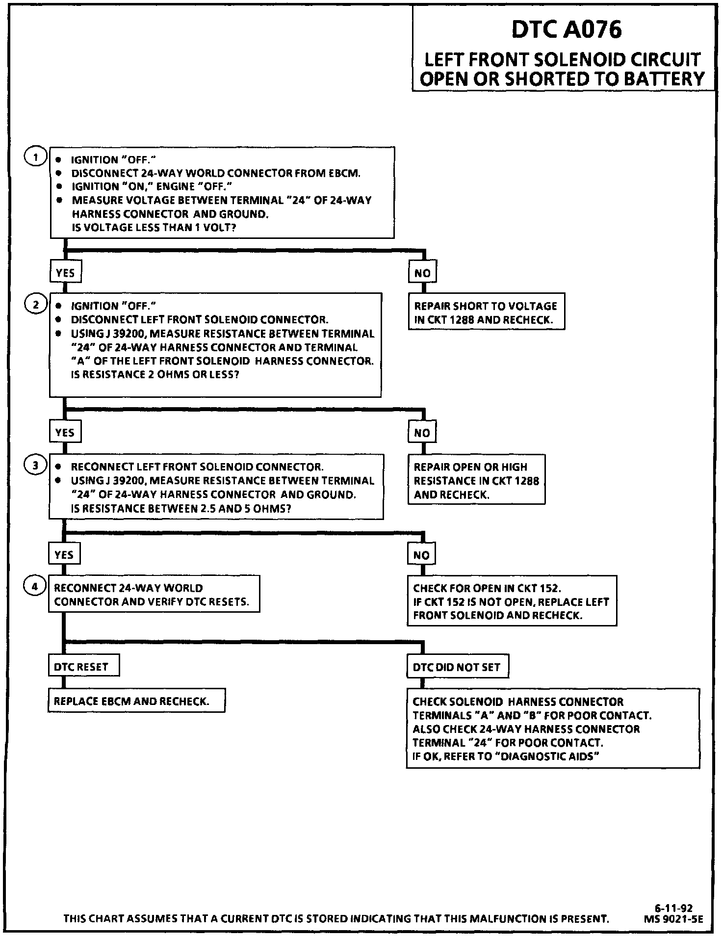 DTC A076 can be set only when the solenoid is commanded "OFF." If the EBCM detects an excessive voltage in the left front solenoid control circuit, a malfunction exists.