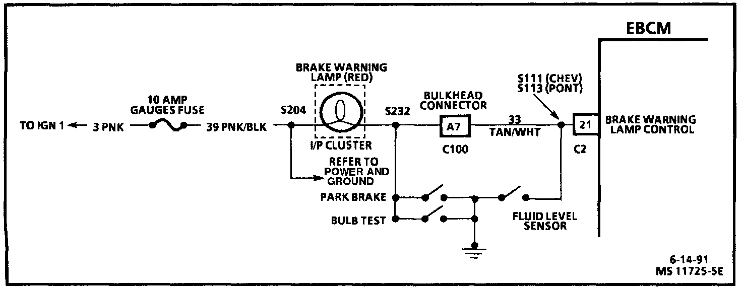 3. The brake warning lamp has current supplied to it through the 10 amp gauge fuse; therefore, this step would indicate if the ignition circuit is complete to the I/P cluster.