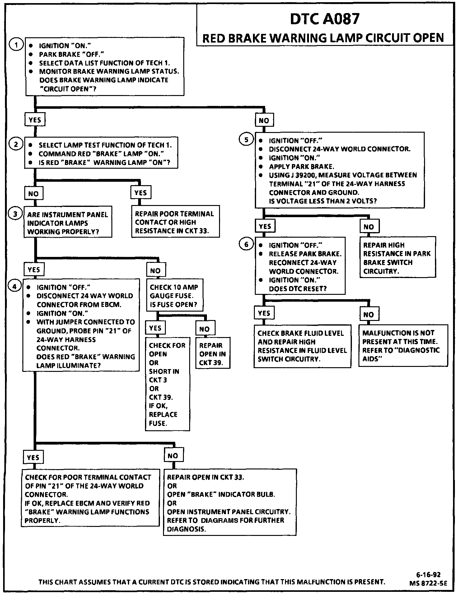 DTC A087 can be set after initialization is completed. If the red brake warning lamp circuit voltage is out of specification indicating an open circuit, a malfunction exists.