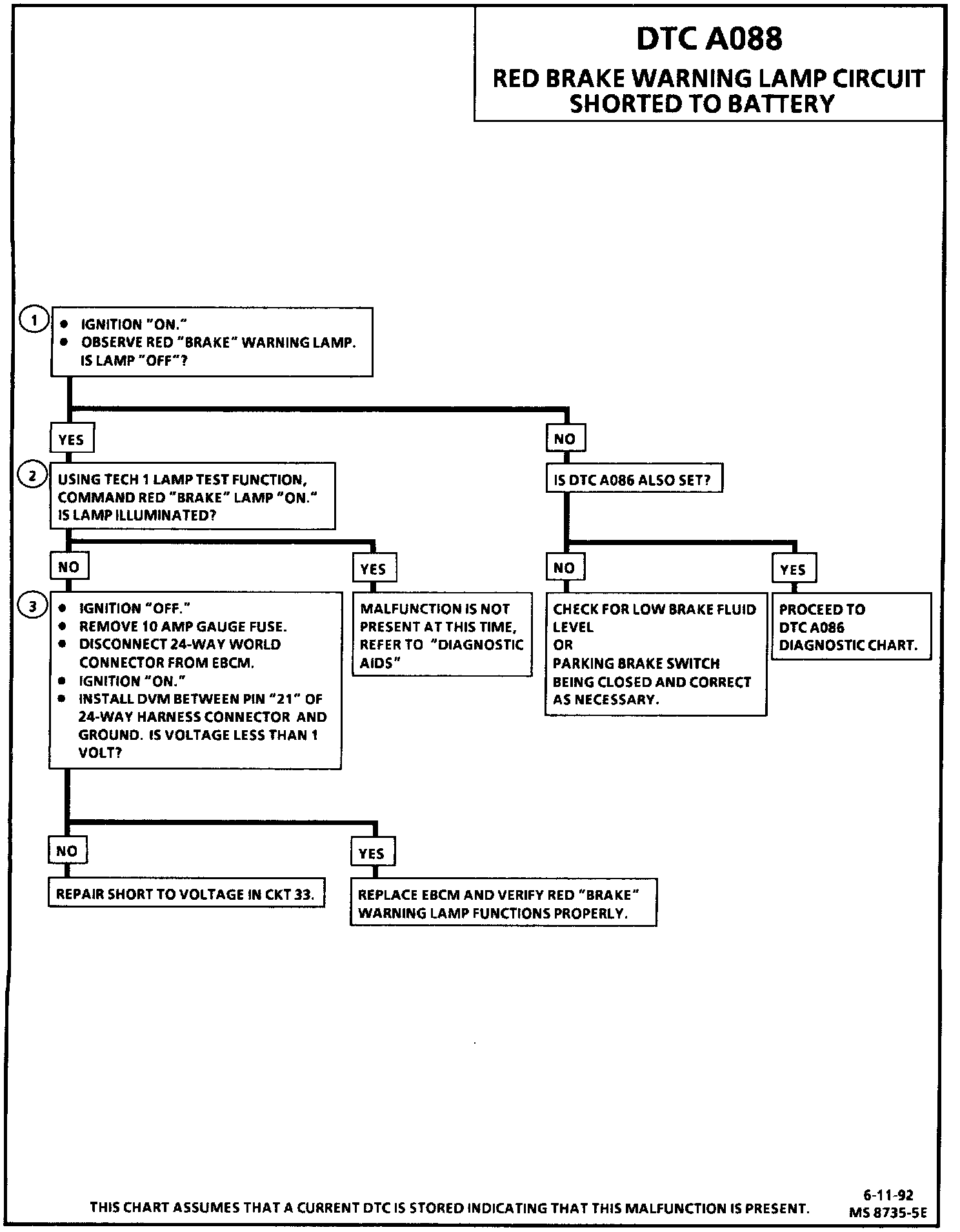 DTC A088 can be set only at the beginning of the three second bulb check. If the EBCM detects battery voltage on the red brake warning lamp control circuit, a malfunction exists.