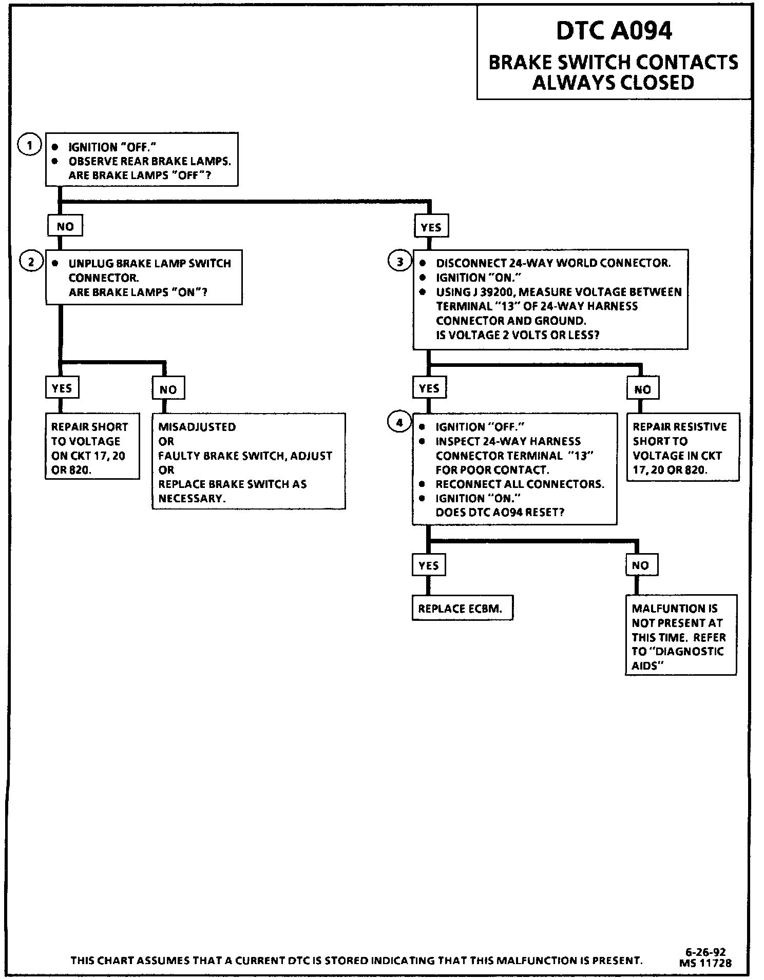 DTC A094 can be set if the vehicle speed reaches at least 40 km/h (25 mph). If the brake was never "OFF" during two consecutive drive cycles, a malfunction exists.