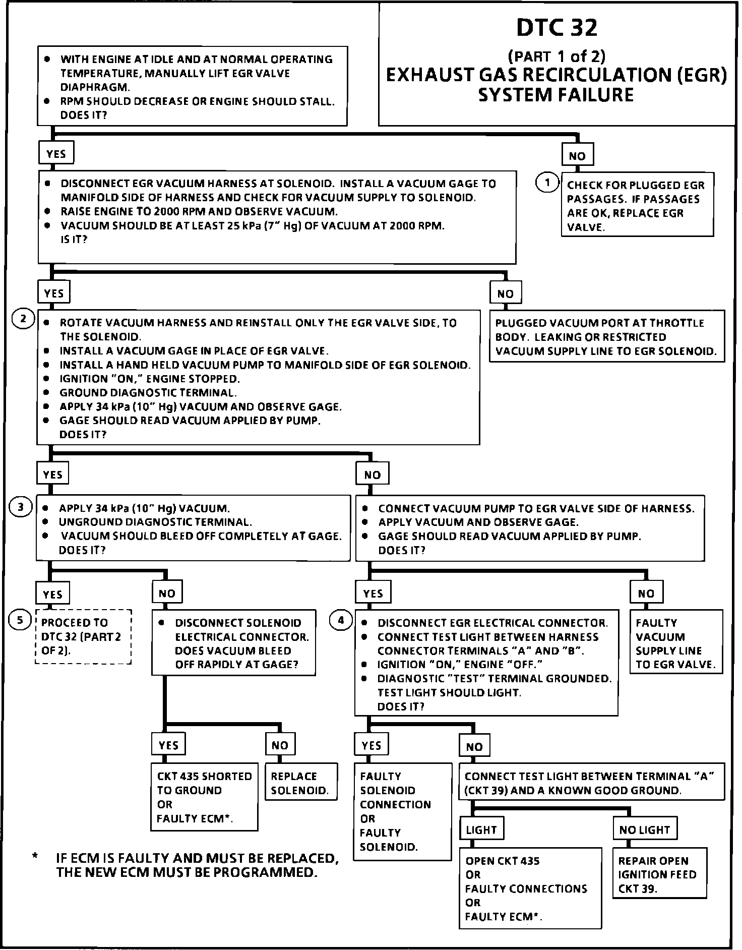 The ECM uses information from various engine sensors to determine when EGR is necessary. Once the ECM has requested EGR by grounding the solenoid circuit, the ECM will monitor engine operating conditions to determine if exhaust gas flow has entered the intake manifold. When the ECM tests for EGR operation and no change in engine operating conditions is indicated, a DTC 32 will set.
