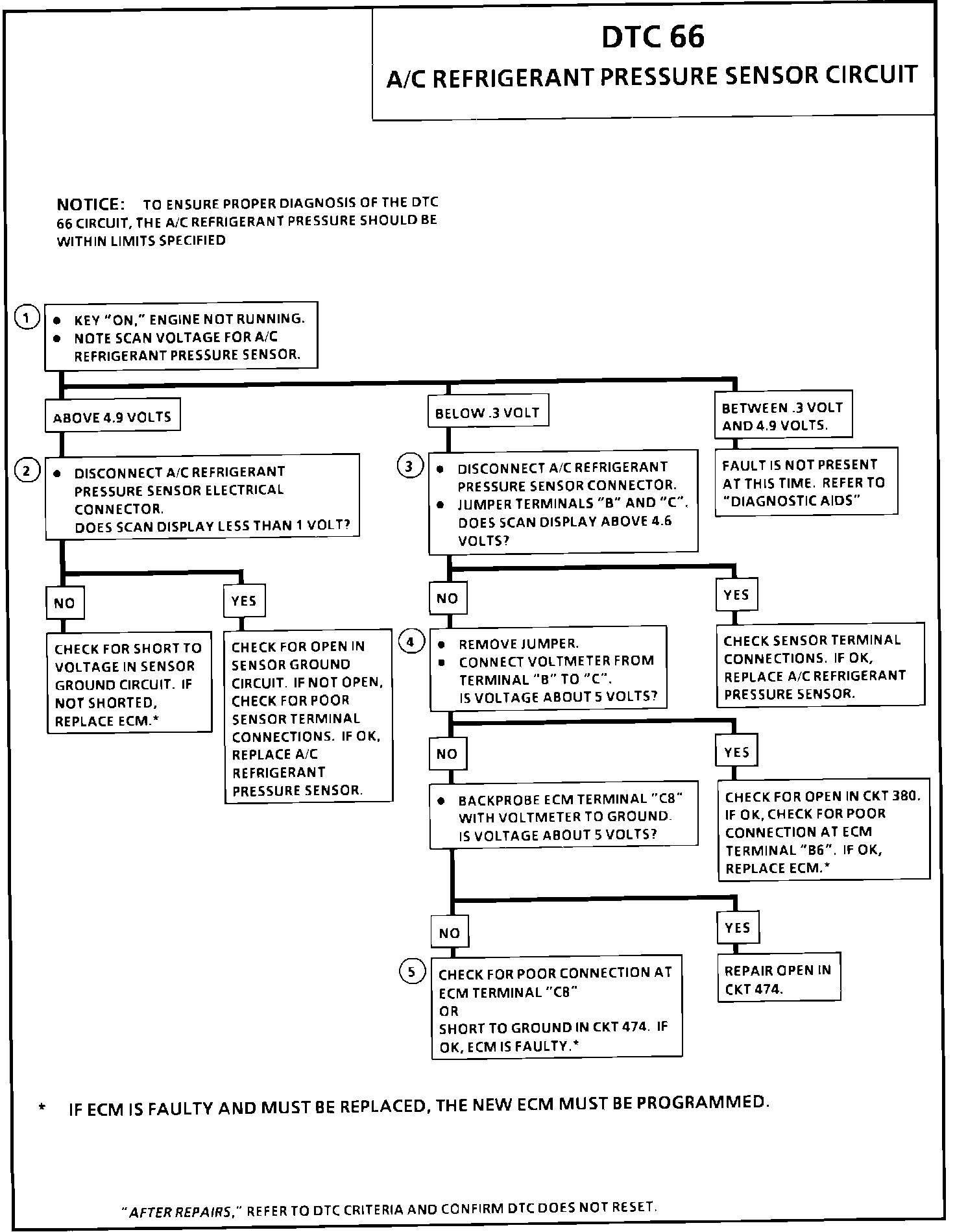 DTC 66 sets when the signal voltage falls outside the normal possible range of the sensor. If signal voltage is greater than .1 volt, but less than .3 volt, there could be a low refrigerant pressure problem with the A/C system. Refer to Heating and Air Conditioning.
