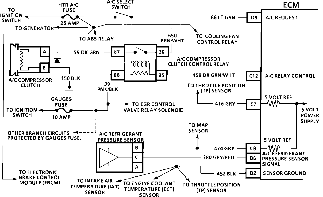 The A/C refrigerant pressure sensor responds to changes in A/C refrigerant system high side pressure. This input indicates how much load the A/C compressor is putting on the engine and is one of the factors used by the ECM to determine IAC valve position for idle speed control. The circuit consists of a 5 volt reference and a ground, both provided by the ECM, and a signal line to the ECM. The signal is a voltage which is proportional to the pressure. The sensor's range of operation is 0 to 454 psi. At 0 psi, the signal will be about .1 volt, varying up to about 4.9 volts at 454 psi or above. DTC 66 sets if the voltage is above 4.9 volts (454 psi) or below .3 volt (7.5 psi) for 5 seconds or more. The A/C compressor clutch is disabled by the ECM if fault is present.
