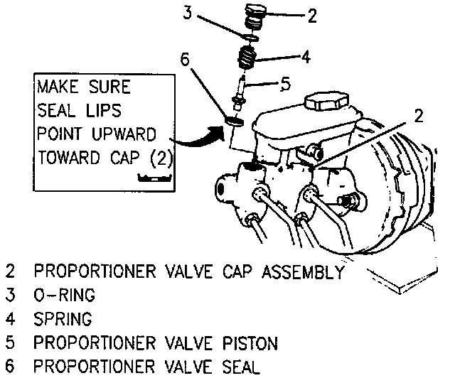 3. Proportioner valve pistons and seals in master cylinder body.