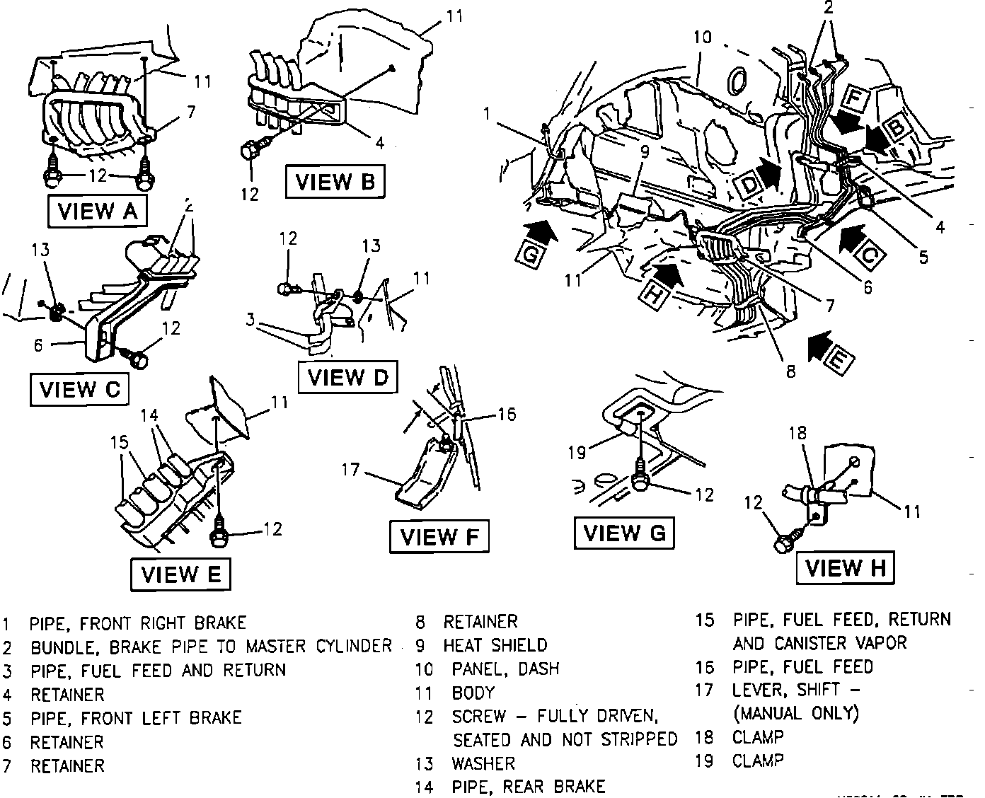 The fuel feed and return pipes extend from the fuel pump/gauge sending unit to the engine compartment. The pipes are secured to the underbody with clip and screw assemblies. Both fuel feed pipes and return pipe must be properly routed and retained, and should be inspected occasionally for leaks, kinks, or dents. If evidence of dirt is found in the fuel rail/injector assembly or fuel filter during disassembly, the pipes should be disconnected and blown out. Check the fuel strainer on the fuel pump/fuel gauge assembly for damage or omission.
