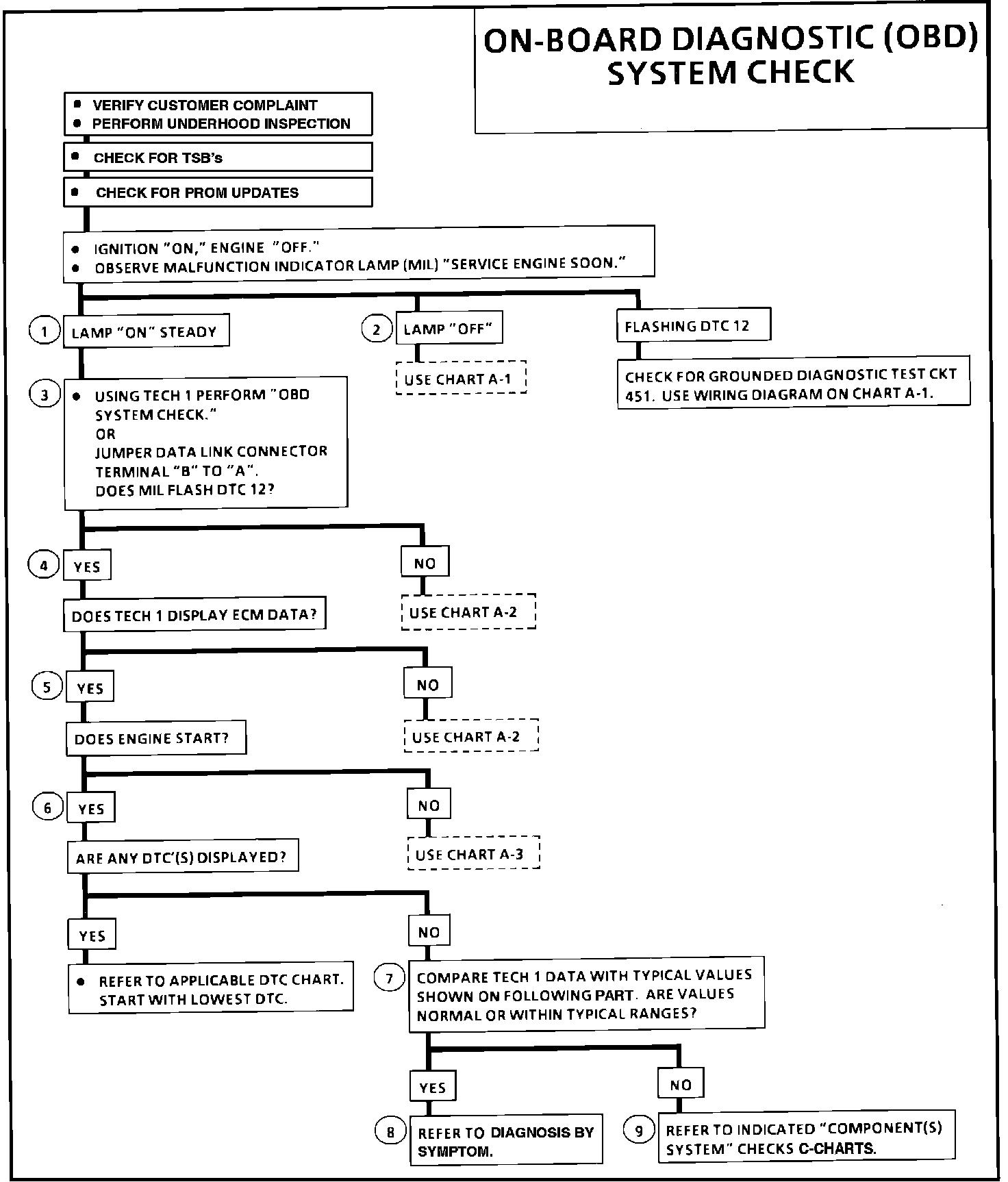 The "On-Board Diagnostic (OBD) System Check" is an organized approach to identifying a problem created by an electronic engine control system malfunction. It must be the starting point for any driveability complaint diagnosis, because it directs the service technician to the next logical step in diagnosing the complaint. Understanding the chart and using it correctly will reduce diagnostic time and prevent the unnecessary replacement of good parts.
