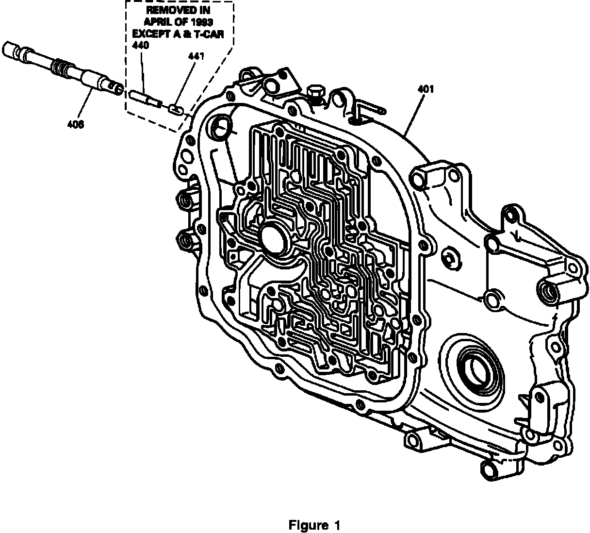 Effective April 1, 1993 (Julian Date 091) the thermo orifice (440) and thermo orifice retainer (441) were eliminated from the manual valve (406). (Thermo orifice (440) and orifice retainer (441) will not be removed on A-Car or T-Car applications. Thermo orifice and retainer may be eliminated on A-Car and T-Car at a later date.)