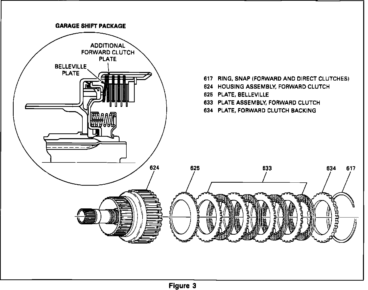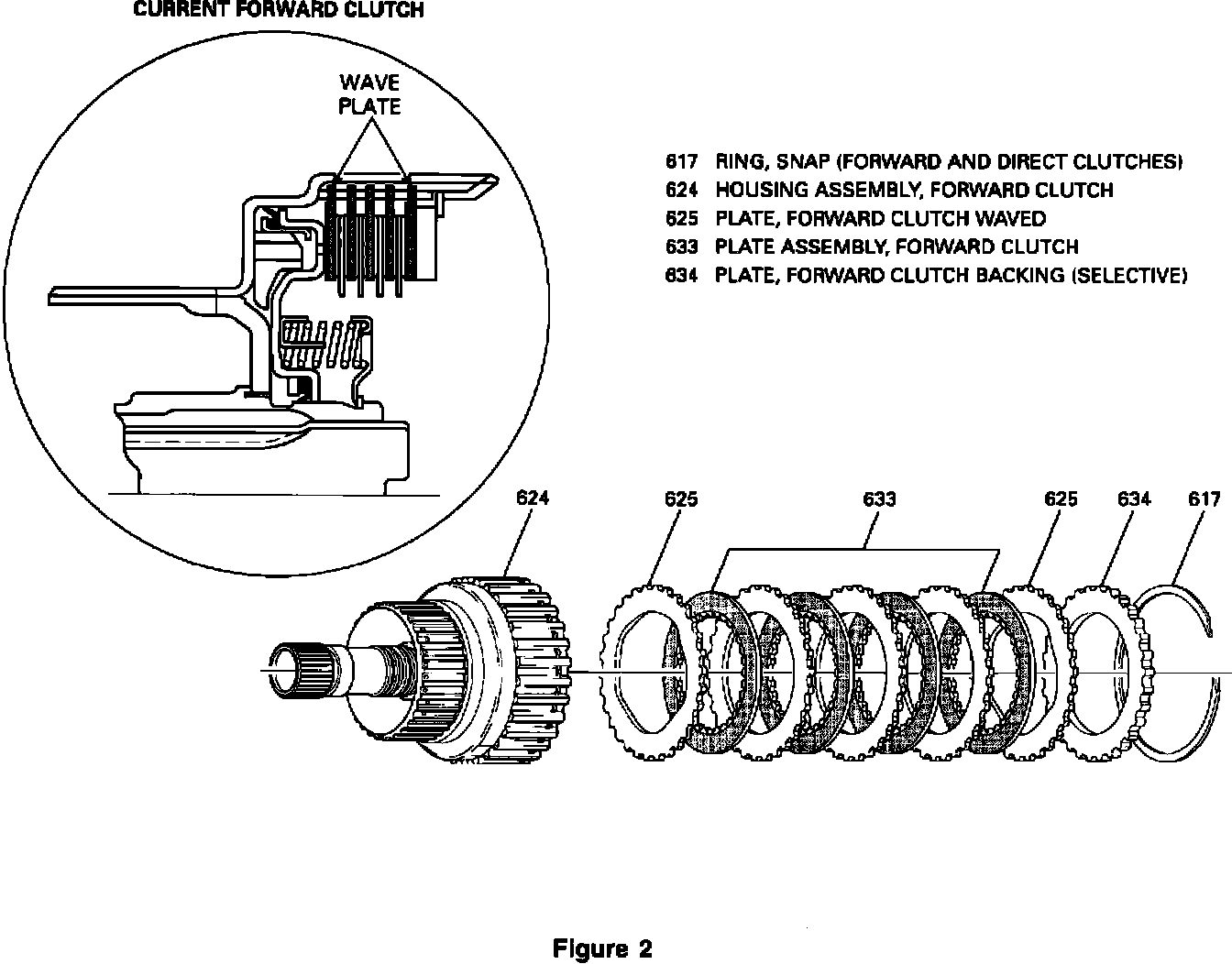 Effective June 22-24, 1993 (Julian Date 152-154) the forward clutch wave plates (625) were replaced with a spring, belleville (625) an additional forward clutch plate (633), a new backing plate (634) (no longer selective), and a new snap ring (617).