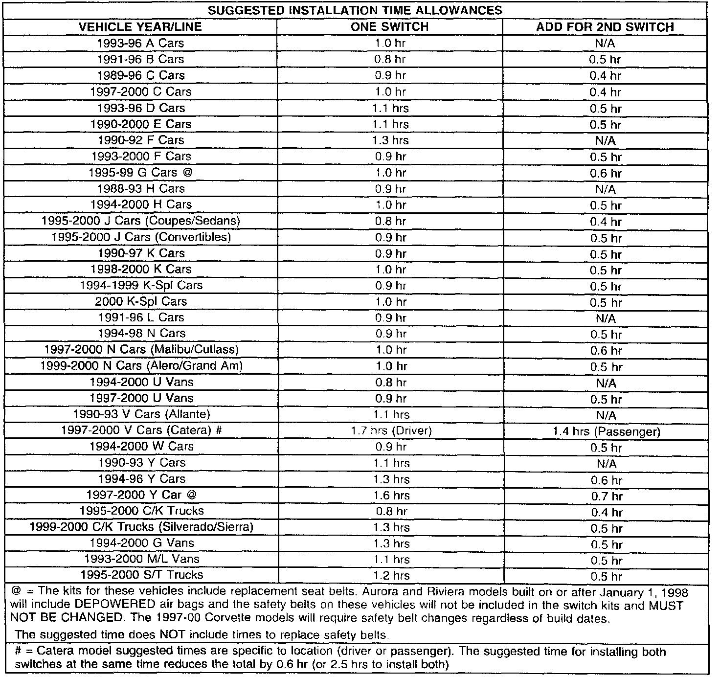USE LABOR OPERATION C8817, CUSTOMER COMPLAINT CODE WK AND FAILURE CODE 93. USE PUBLISHED LABOR OPERATION TIMES. When installing switch kits on 1995-98 Aurora, Riviera and 1997-00 Corvette models, the appropriate safety belts must be replaced. When submitting claims, use the existing labor operation and time allowances with special customer complaint and failure codes. The LABOR ONLY may be claimed. The cost of the belt is included in the kit price.