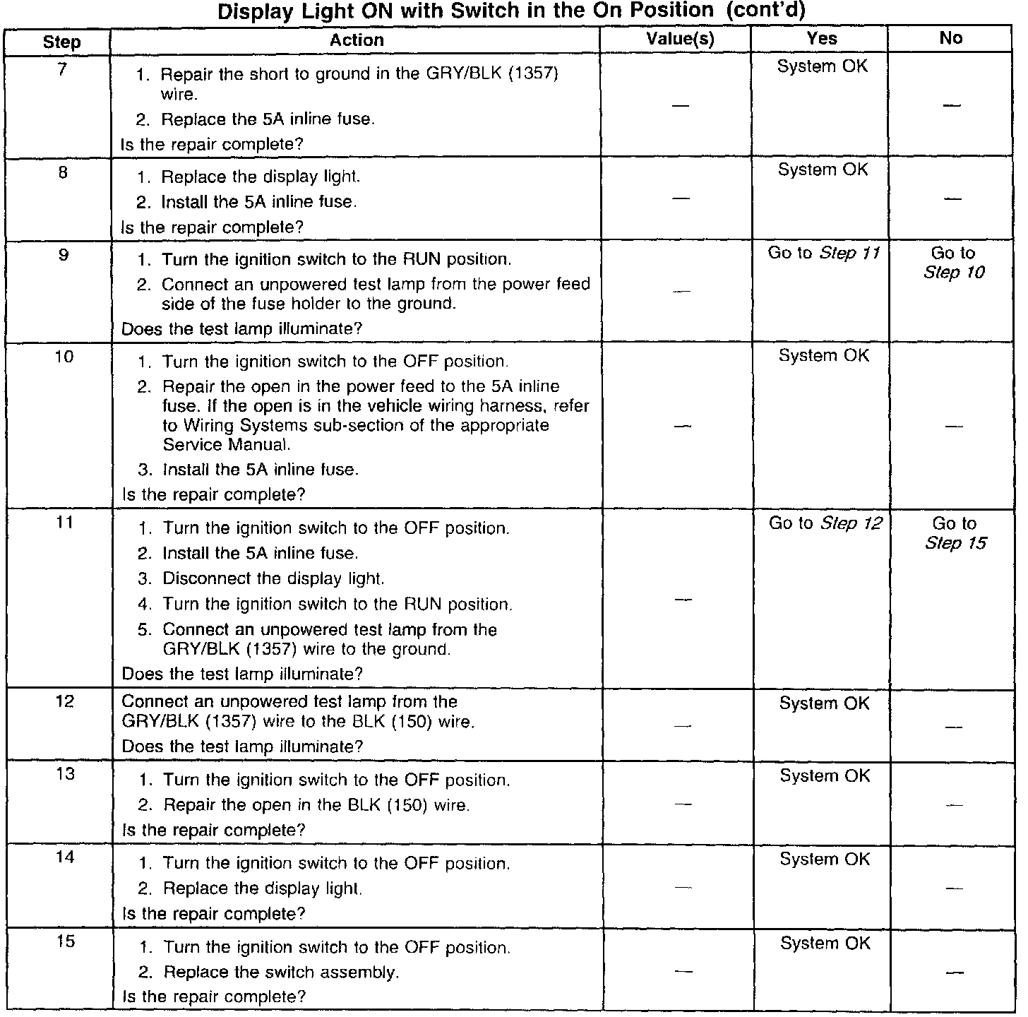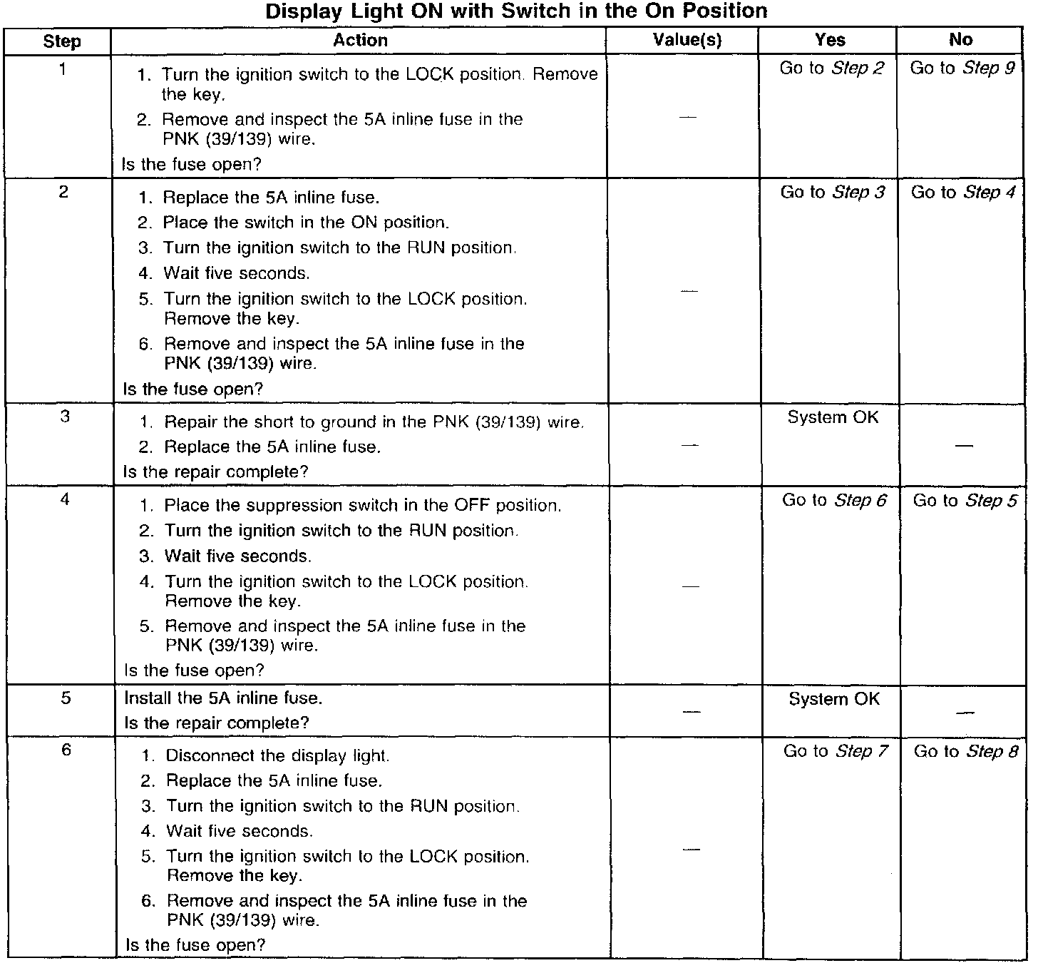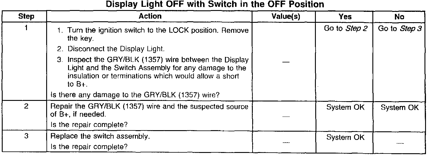 Diagnostics for the switch and display light are included in the illustrations. As always, the technician should make sure to review the wiring harness routing and installation for pinching, rubbing and chafing to brackets, braces (etc.) and take appropriate actions to protect the wiring from those potential conditions.
