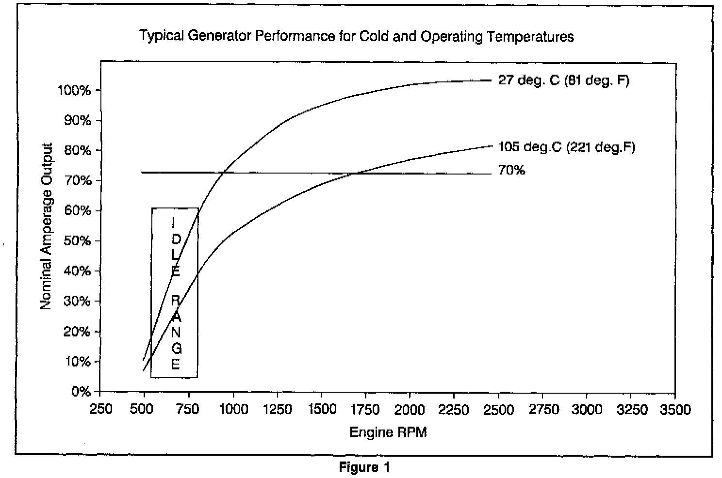 Depending on the vehicle application, normal generator output at idle can be as low as 35% of the full rated output (see Figure 1). With enough electrical loads, it is easy to exceed the low speed generator output at idle. This is a NORMAL condition that the battery can compensate for during short periods. Items that affect the vehicle system voltage at idle are driving conditions, the number of electrical loads being used, add-on accessories, and extended idle times. Normal driving conditions will recharge the battery and restore the charging system to its normal state.