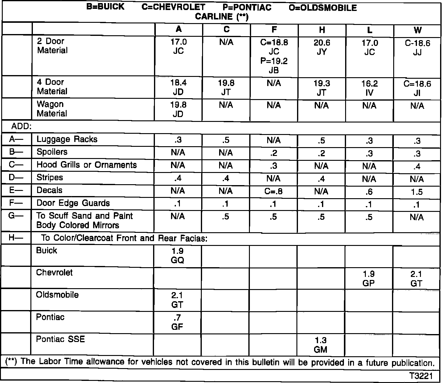 The time allowances provided on the chart includes the hardware removal and installation (as indicated by the list guidelines), the masking and unmasking of the vehicle, clearcoat removal (as indicated by the guidelines), the refinish (and colorcoat when required), mix time for primer/paint and clearcoat, finesse/polish where required, washing and preparing the vehicle for delivery.