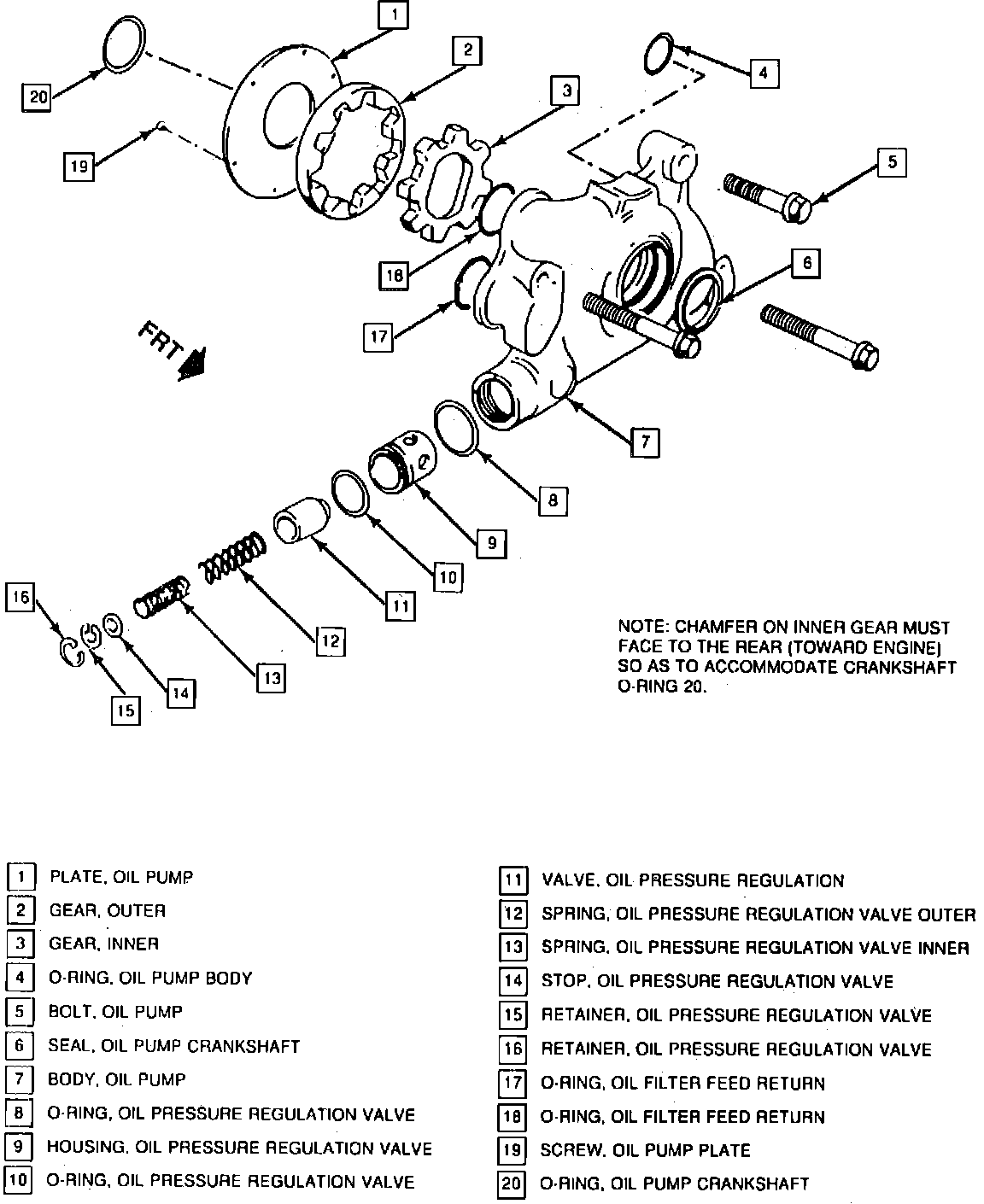 4. Position inner and outer gears into pump housing. Place inner gear into pump housing with chamfer facing rear of pump housing (toward engine). Place outer pump gear in housing with chamfer facing toward recess in pump housing.