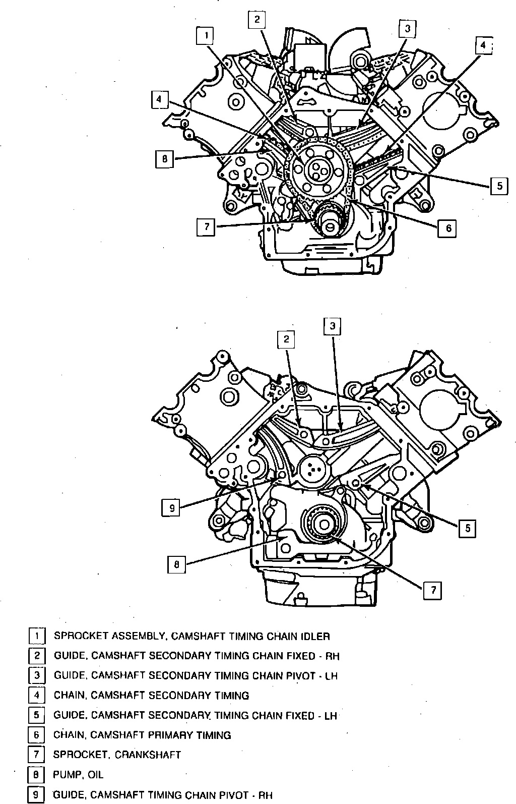 7. Reverse procedure to install. Apply Loctite 262 or equivalent to idle sprocket attaching and primary timing guide bolt threads prior to installation. When installing primary timing chain guide, use only finger pressure to remove slack from chain.
