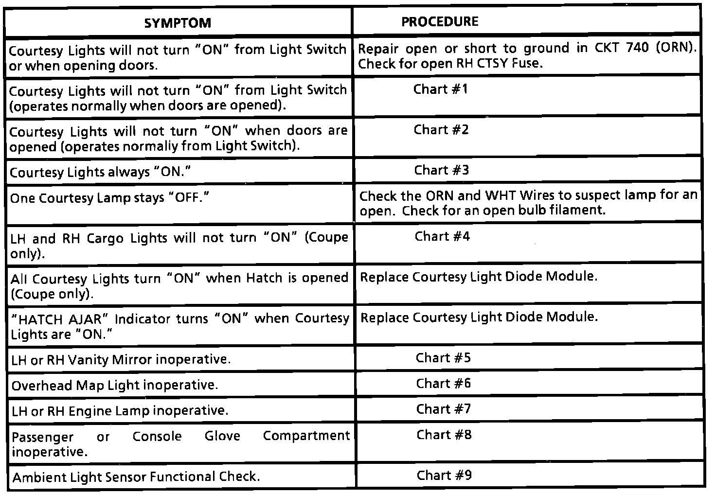 Interior Lamps Symptom Diagnosis Chart: