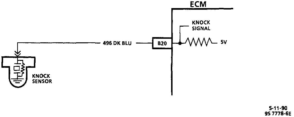 The ECM applies a 5 volt reference voltage to the knock sensor circuit through a resistor in the ECM, and then monitors the voltage in the circuit. A resistor to ground within the knock sensor causes the ECM's 5 volt reference to drop, so that under a no knock condition, the signal circuit should measure about 2.5 volts. This is the "bias" voltage that the knock sensor signal is carried on, to ensure that even a slight knock will produce a voltage "spike" that rises above the threshold voltage of about 3 volts to indicate a knock.