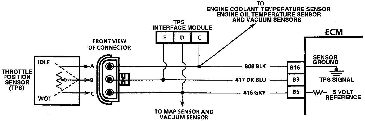 NOTE: The throttle position sensor must provide closed throttle output voltage within a specified range, and then the ECM must "learn" this voltage to operate properly. If the sensor output is out-of-range, or if the sensor has been removed from the throttle body and re-installed or replaced, the adjustment and learn procedure must be performed. (See below)