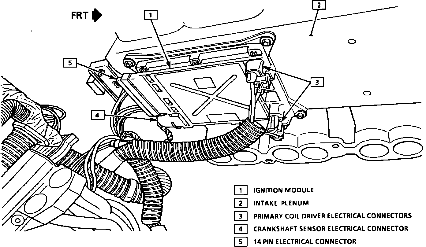 The Ignition Control Module monitors the crank sensor signals and based on these signals sends a reference signal to the ECM so that correct ignition and fuel injection control can be maintained during all driving conditions. During cranking, the DIS module monitors the "sync pulse" to begin the ignition firing sequence, and below 400 rpm the module controls spark advance by triggering each of the four coils at a pre-determined interval based on engine speed only. Above 400 rpm, the ECM controls the spark timing through the module (EST), and compensates for all driving conditions. The DIS module must receive a "sync pulse" and then a crank signal in that order to enable the engine to start. The are no serviceable parts in the ignition module. If a module develops a fault, it must be replaced.