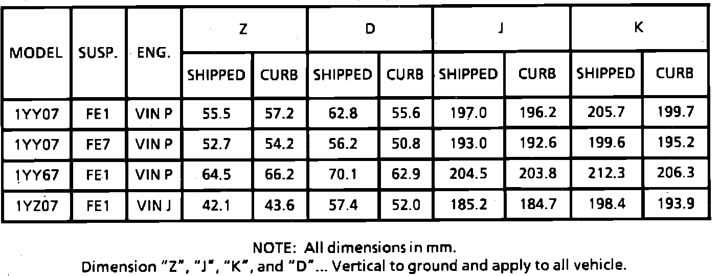Fig. 9 Ride Height Specifications. 1992 (EF1=Soft Ride Suspension; FE7=Heavy Duty Suspension; VIN P=V8-350/5.7L Single Cam Engine; VIN J=V8-350/5.7L 4 Cam Engine; 1YY07=Hatchback; 1YY67=Convertible; 1YZ07=ZR-1 Hatchback):