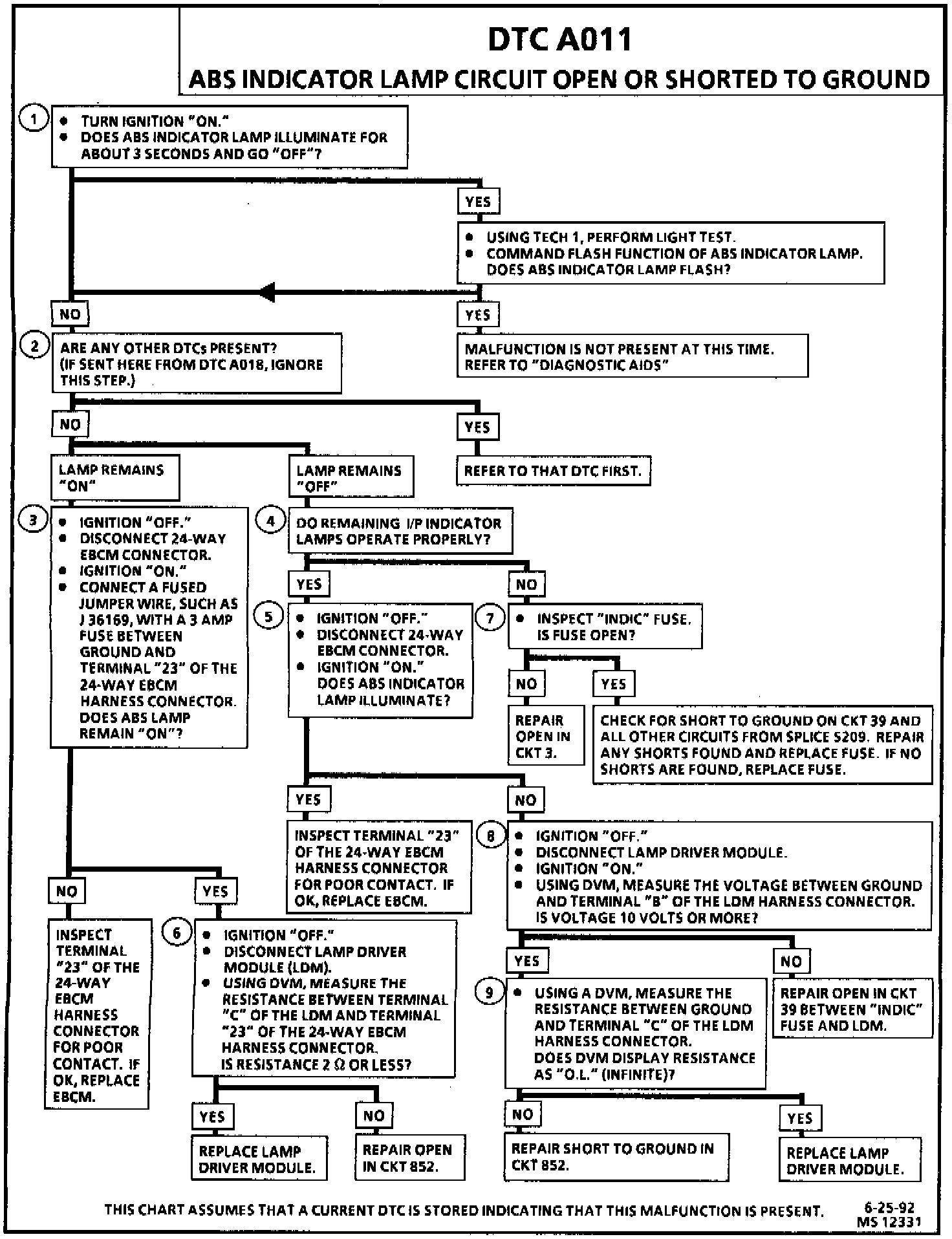 DTC A011 can be set only during the three second bulb check or when the ABS indicator lamp is commanded "ON." If the EBCM cannot control the ABS indicator lamp for two seconds, a malfunction exists.