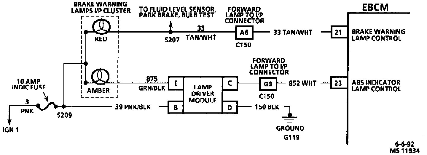 This DTC checks the state of the ABS indicator lamp to identify a situation in which the driver could not be warned of a system malfunction by the ABS indicator lamp, or the indicator lamp is always "ON." The Lamp Driver Module (LDM) turns the ABS indicator lamp "ON," unless the Electronic Brake Control Module (EBCM) provides ground to turn it "OFF." Because of the circuitry in the LDM, only external malfunctions can be detected. As a result, the ABS indicator lamp itself is not diagnosable, only the control line to the EBCM can be diagnosed. In the event of an open CKT 852, the ABS indicator lamp will be "ON" at all times, due to the loss of ground at the LDM input. If the control line is shorted to ground, the ABS indicator lamp is kept "OFF," due to the LDM input being grounded.