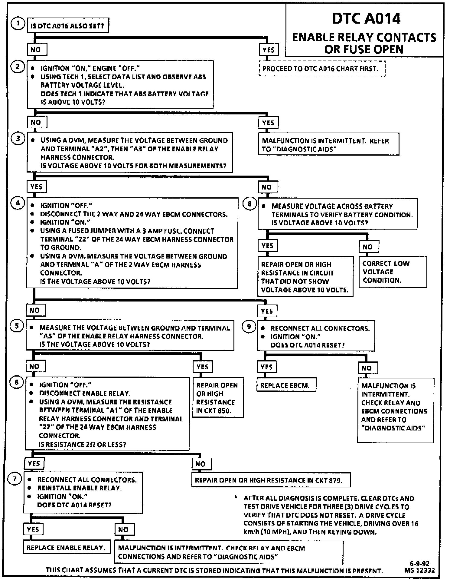 DTC A014 can be set anytime after the EBCM commands the enable relay "ON" (the relay is first commanded "ON" during the three second bulb check). This test monitors the availability of current/voltage to the motors and solenoids. This malfunction indicates voltage is not available and would therefore not allow ABS operation if required.