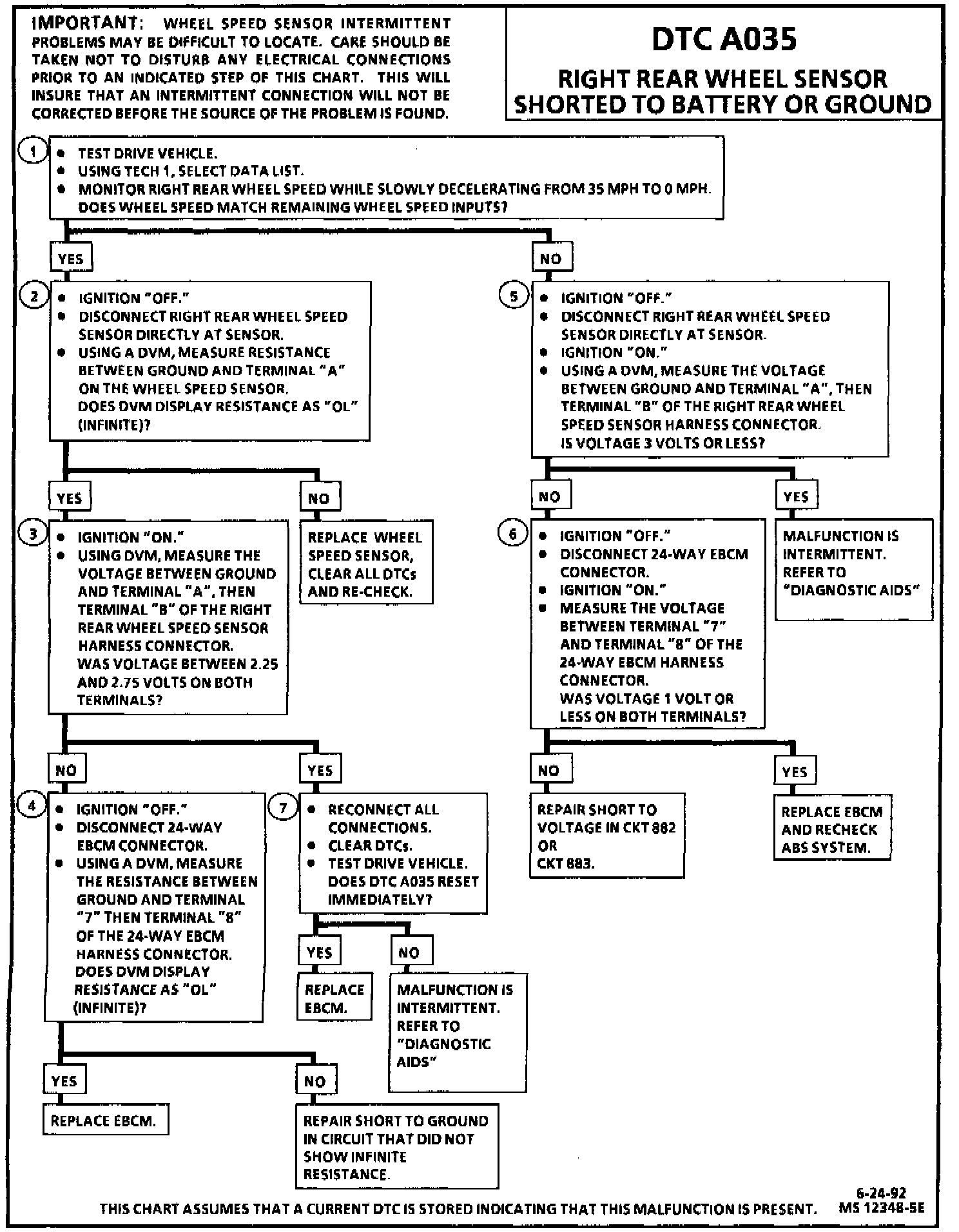 DTC A035 can be set anytime after initialization. If either of the right rear wheel speed circuits are shorted to voltage or ground, a malfunction exists.