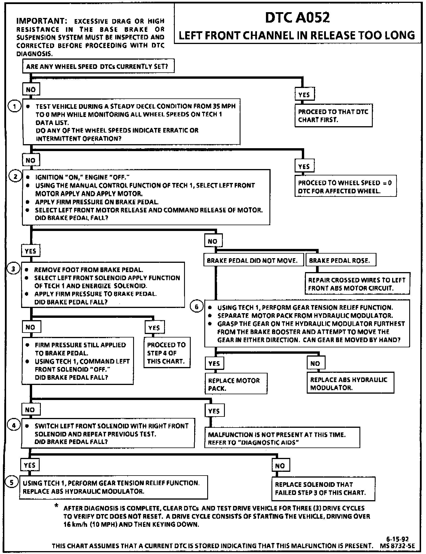 The frequency of the malfunction can be checked by using the enhanced diagnostic function of the Tech 1. DTC A052 may fail if on ice and steering wheel is turned to lock during braking. Using the Tech 1, perform hydraulic test to ensure total brake system is functional.