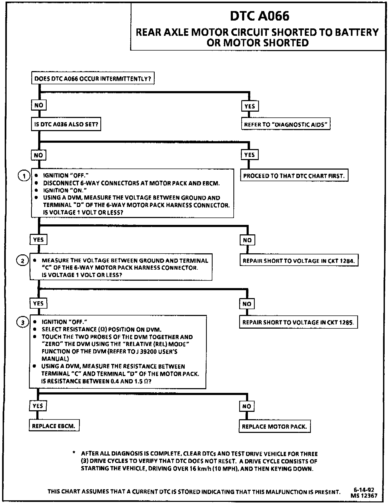 DTC A066 can be set only when the motor is commanded "OFF." If the Electronic Brake Control Module (EBCM) detects an out of range voltage on either of the rear axle motor circuits indicating a circuit shorted to battery or a motor shorted, a malfunction exists.
