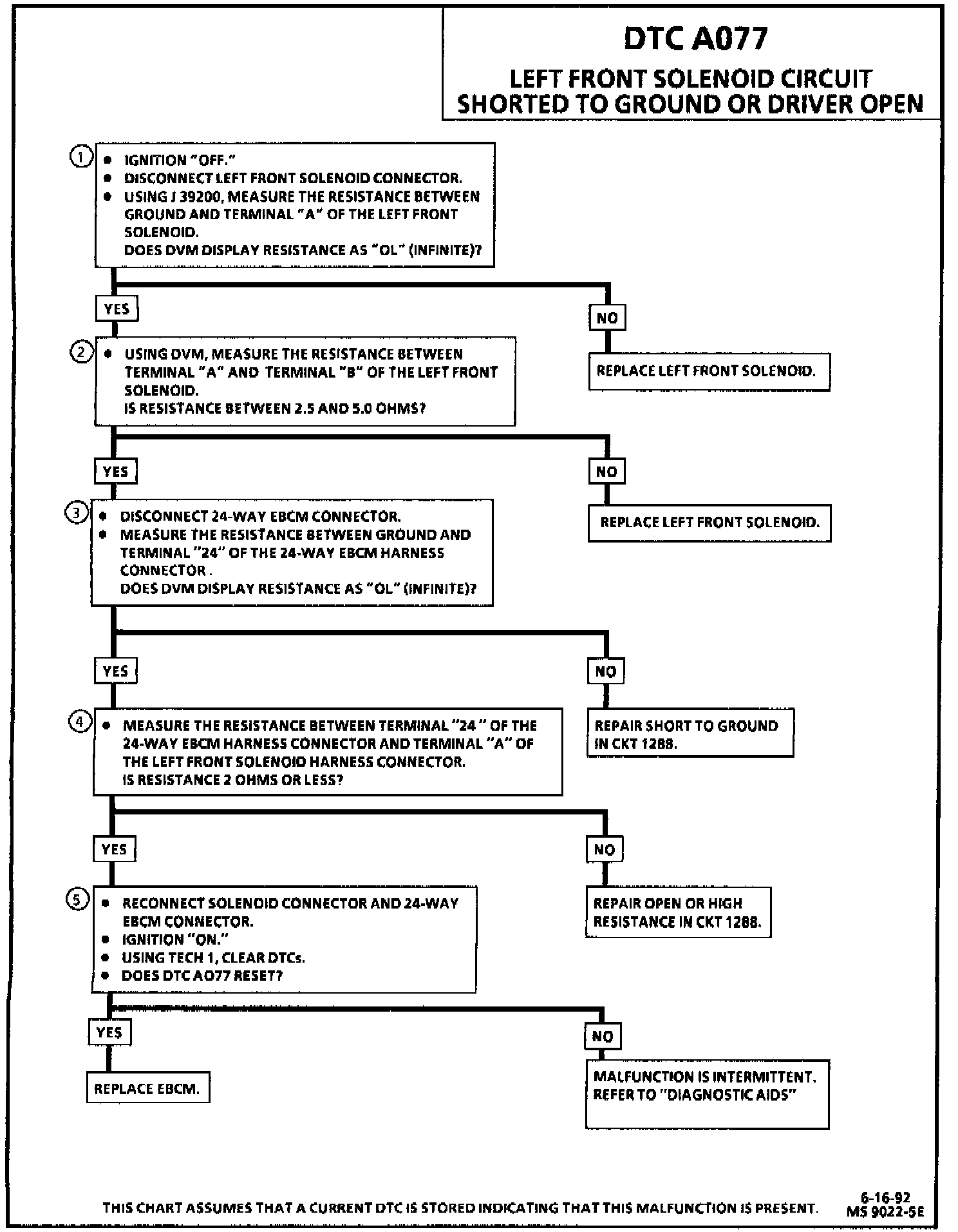 DTC A077 can be set only when the solenoid is commanded "ON." If the Electronic Brake Control Module (EBCM) detects the left front solenoid control circuit voltage is out of specification, a malfunction exists.
