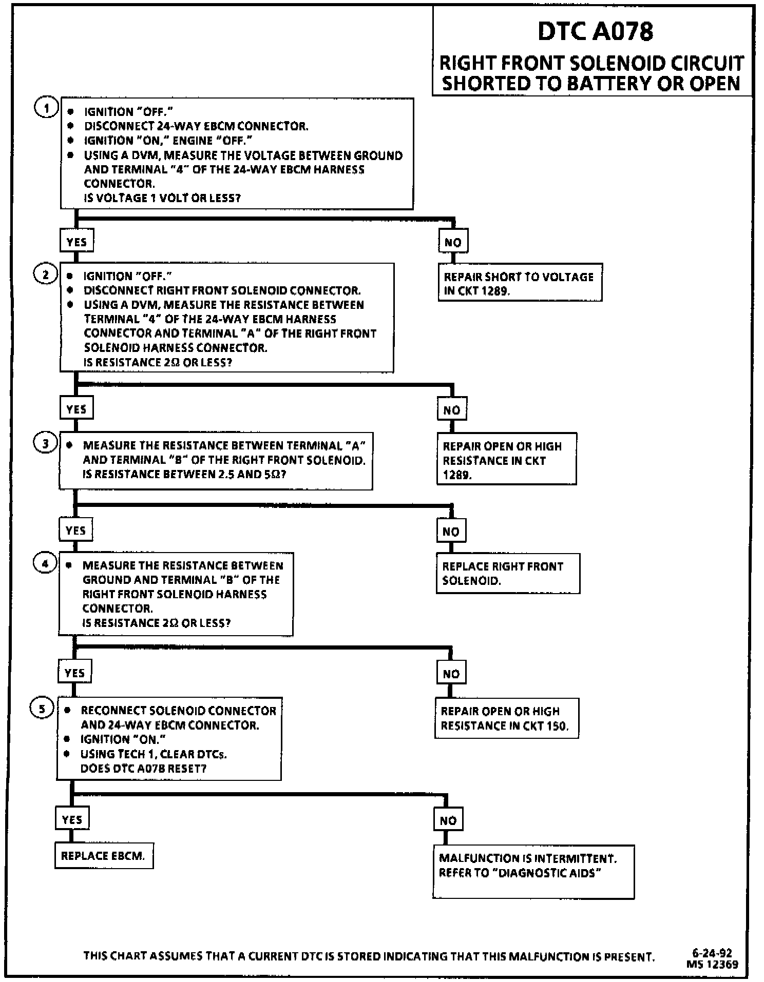 DTC A078 can be set only when the solenoid is commanded "OFF." If the Electronic Brake Control Module (EBCM) detects an excessive voltage in the right front solenoid control circuit, a malfunction exists.