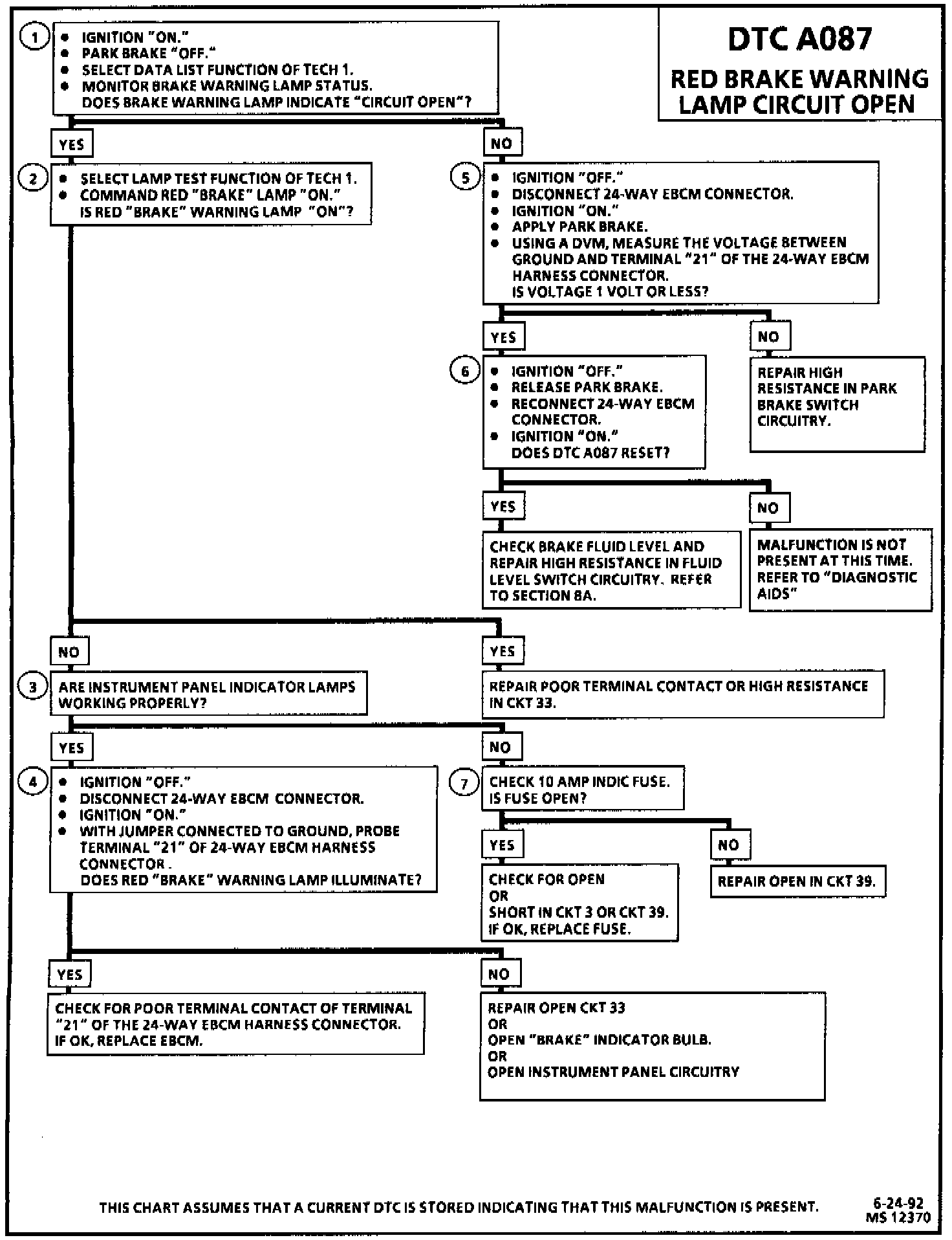 DTC A087 can be set after initialization is completed. If the red brake warning lamp circuit voltage is out of specification indicating an open circuit, a malfunction exists.