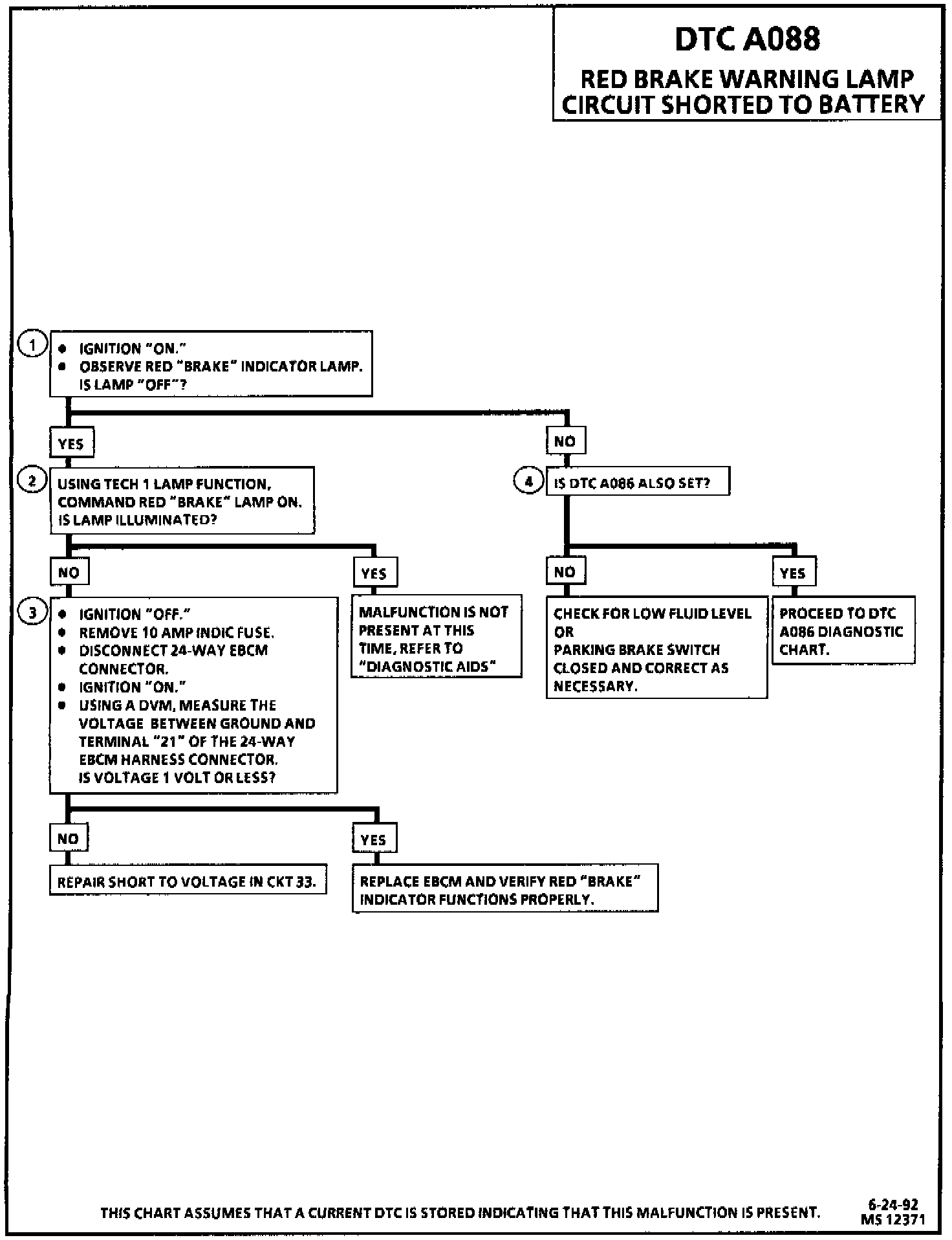 DTC A088 can be set only at the beginning of the three second bulb check. If the EBCM detects battery voltage on the red brake warning lamp control circuit, a malfunction exists.