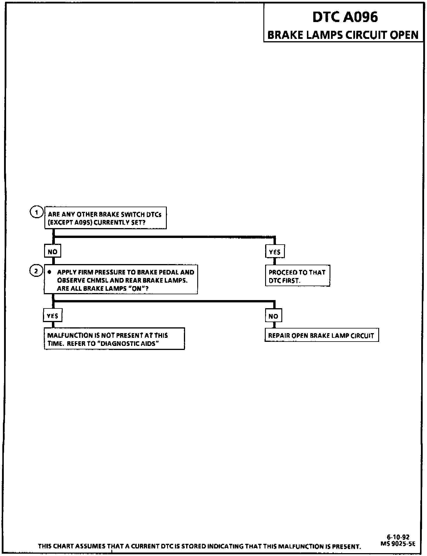 This DTC is designed to isolate the cause of a DTC A095 malfunction and indicate to the driver ABS is still available. If DTC A095 fails with DTC A096, the brake lamps are open, the brake lamp grounds are open, or the Center High Mounted Stop Lamp (CHMSL) circuit is open during 4 way flasher use. The presence of battery voltage at the brake switch input indicates a valid brake switch input is still available.
