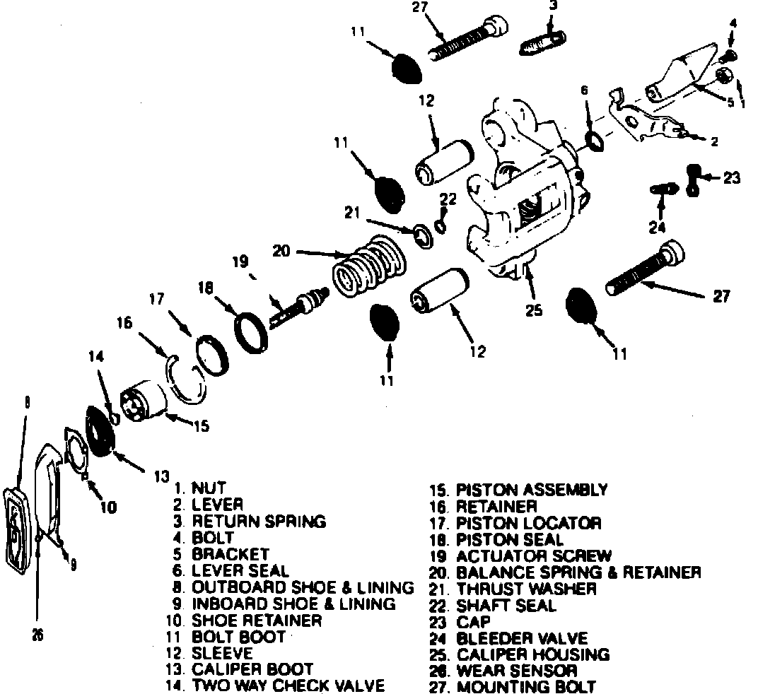 The caliper includes an integral parking brake mechanism. When the parking brake is applied, the lever turns an actuator screw which is threaded into a nut in the caliper piston. As the actuator screw turns, the piston is forced out, applying force on the rotor. The piston contains a self-adjusting mechanism to keep the parking brake in proper adjustment and to ensure proper clearance when the parking brake is released.
