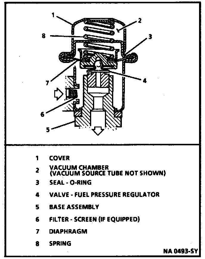 The fuel pressure regulator assembly is a diaphragm-operated relief valve with fuel pump pressure on one side, and regulator spring pressure and intake manifold vacuum on the other.