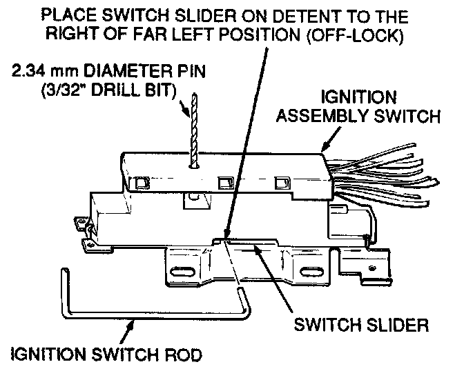 Important: Insert a 2.34 mm diameter pin (3/32" drill bit) in adjustment hole on ignition switch to hold switch slider in proper position during installation.