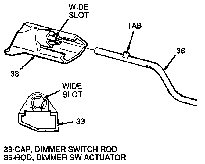 5. Dimmer switch actuator rod (36), tab end first, through hole in "IP" bracket and into hole in dimmer switch rod cap (33). (Tab on rod (36) must engage wide slot in rod cap (33) and snap in place as shown.)