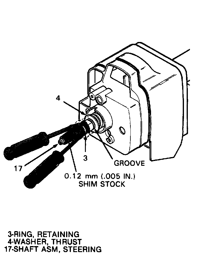 12. Wrap a two inch wide piece of shim stock 0.127mm (0.005 in.) around the shaft and slip a new retaining ring (3) up to thrust washer (4). Use two long handled screwdrivers and push on retaining ring (3) until it seats in the retainer ring groove in shaft (17).