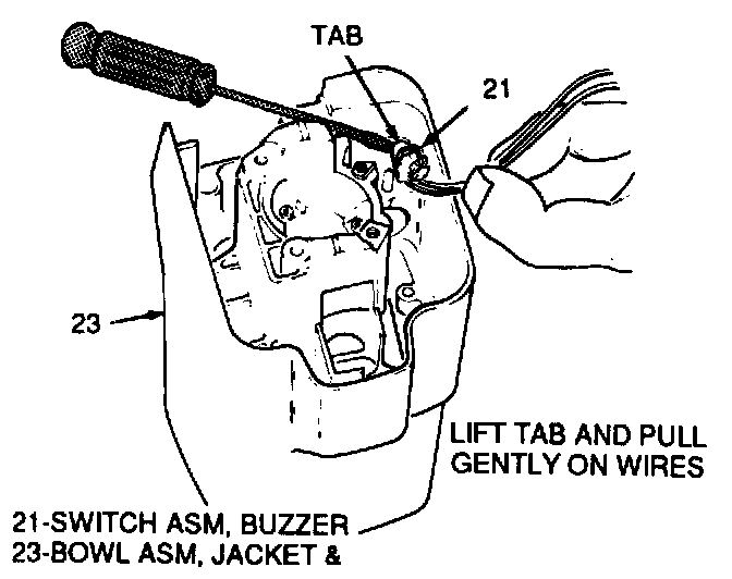 16. Buzzer switch (21). Use screw driver to lift switch tab and pull gently on wires to remove.