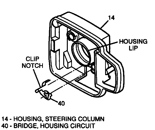 5. Housing circuit bridge (40) to housing (14) with clip notch over housing lip (40).