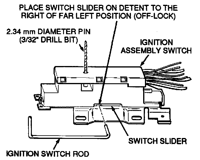 Important: Insert a 2.34 mm diameter pin (3/32" drill bit) in adjustment hole on ignition switch to hold switch slider in proper position during installation.