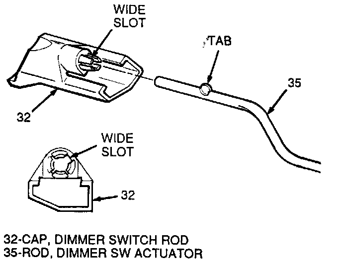 5. Dimmer switch actuator rod (35), tab end first, through hole in "IP" bracket and into hole in dimmer switch rod cap (32). Tab on rod (35) must engage wide slot in rod cap (32) and snap in place.