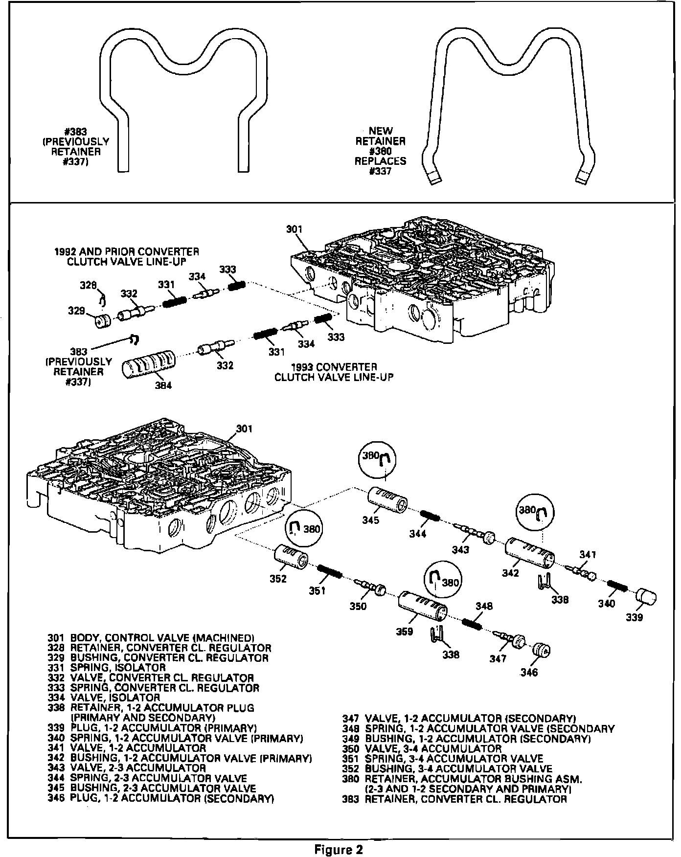 Also, a new design has been released for 1993 on the 4T60-E transaxle "Converter Clutch Regulator" line-up (Figure 2). The new design has eliminated the valve bore plug (329) and spring clip retainer (314), and replaced them with a converter clutch regulator bushing (384). The bushing is secured in place with converter clutch retainer (383), which was previously retainer (337).
