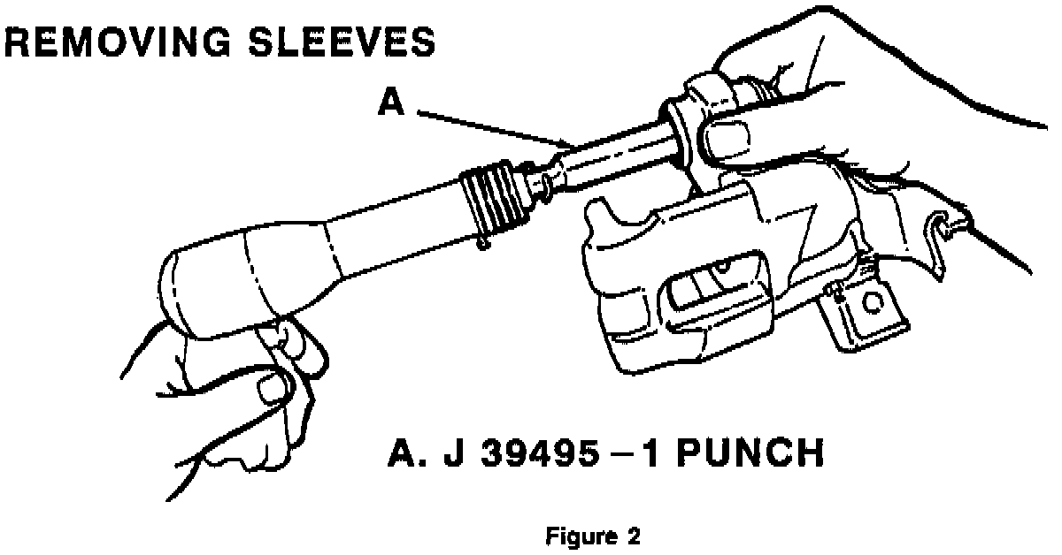 5. Use an air hammer with Kent Moore Tool J-39495-1 to remove sleeves. When using this tool, it is not necessary to remove the boots first (See Figure 2). By applying considerable pressure with the air hammer and tool, the sleeves will be driven right past the boots. Hold the caliper in one hand and drive the sleeve and boots out. Use care not to drop the sleeve as it is pushed out, and then remove any remaining boot material.