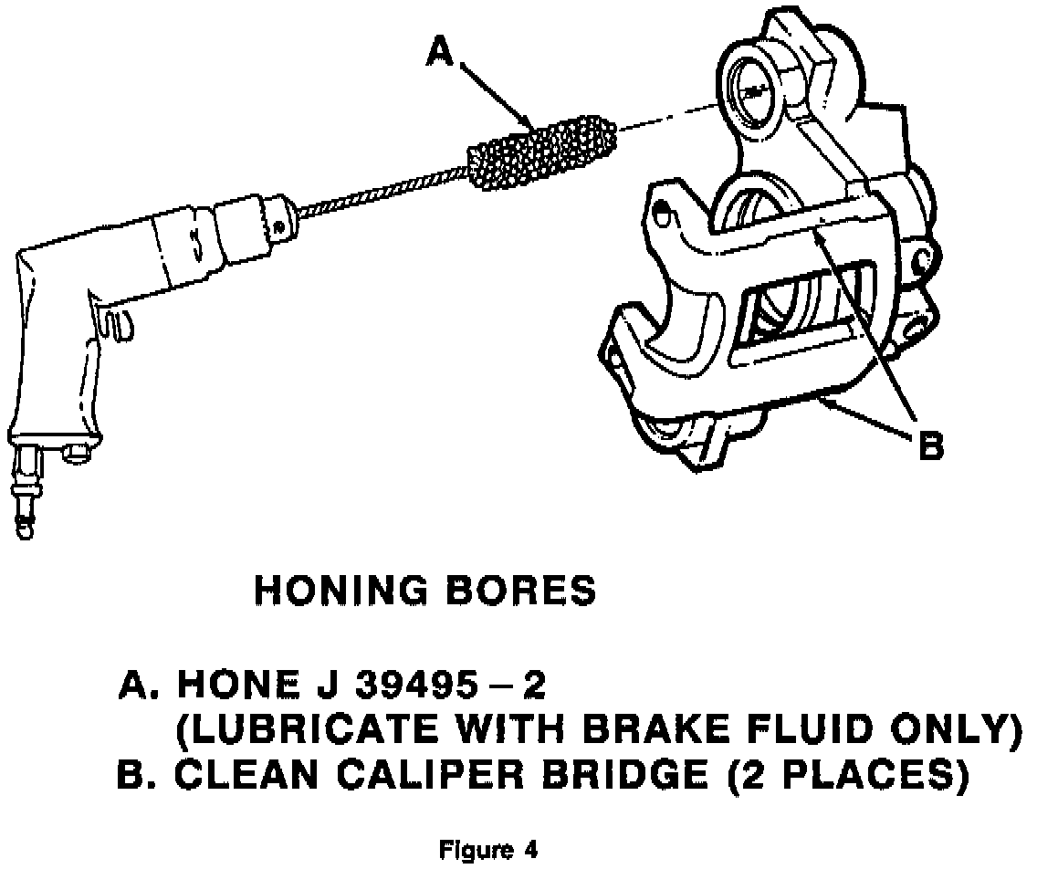 B. Bores should be further cleaned with a 7/8" flex hone mounted on an air/electric drill motor. Use Kent Moore Tool J-39495-2 (or equivalent). Use brake fluid as a honing fluid. DO NOT USE ANY PETROLEUM BASED FLUIDS. THEY ATTACK RUBBER USED ON THE CALIPER (See Figure 4).