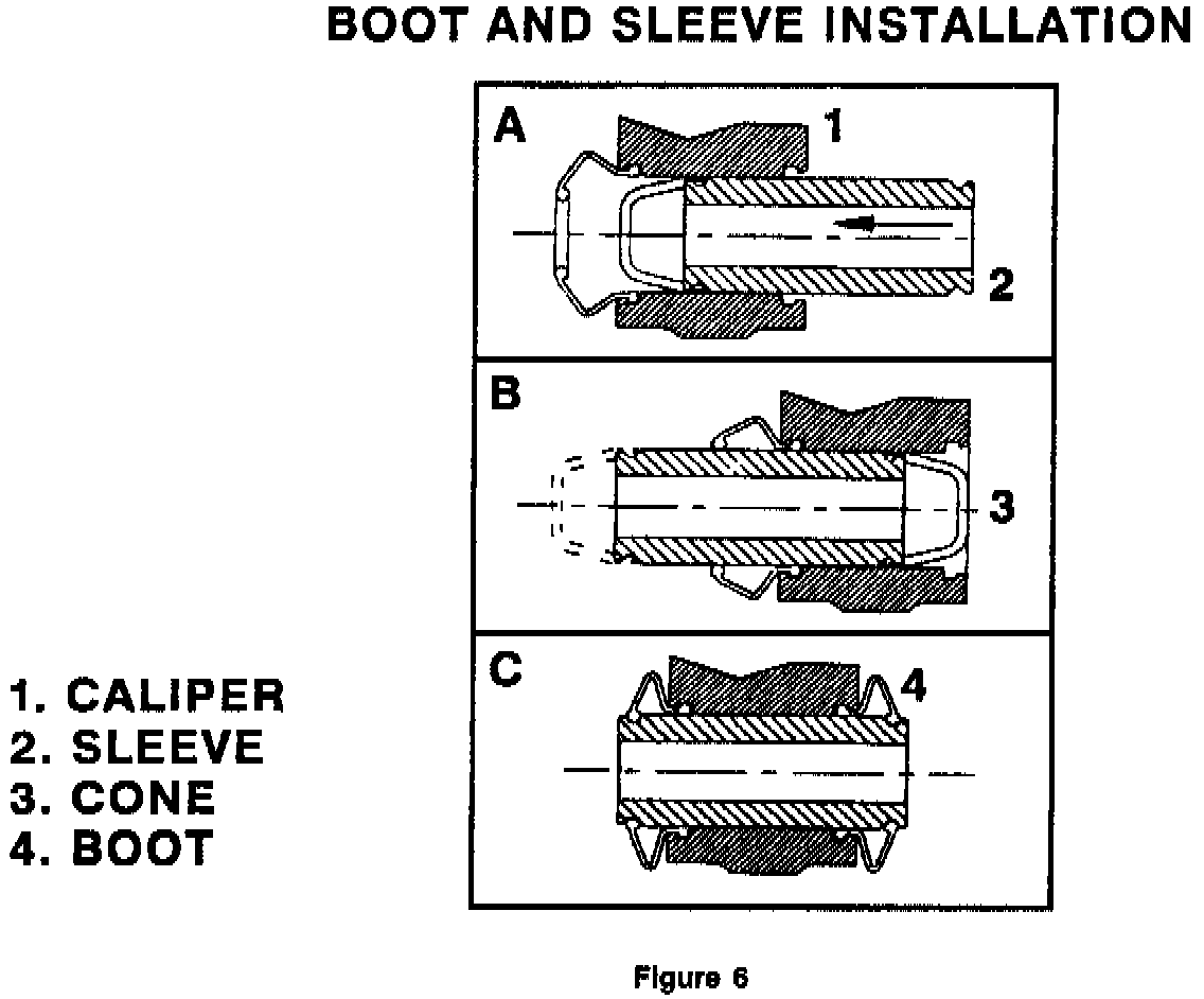 16. Cycle each sleeve back and forth in caliper several times to insure that no part of the boot is protruding from the groove in the caliper bore, and that boot beads are secure in sleeve grooves.
