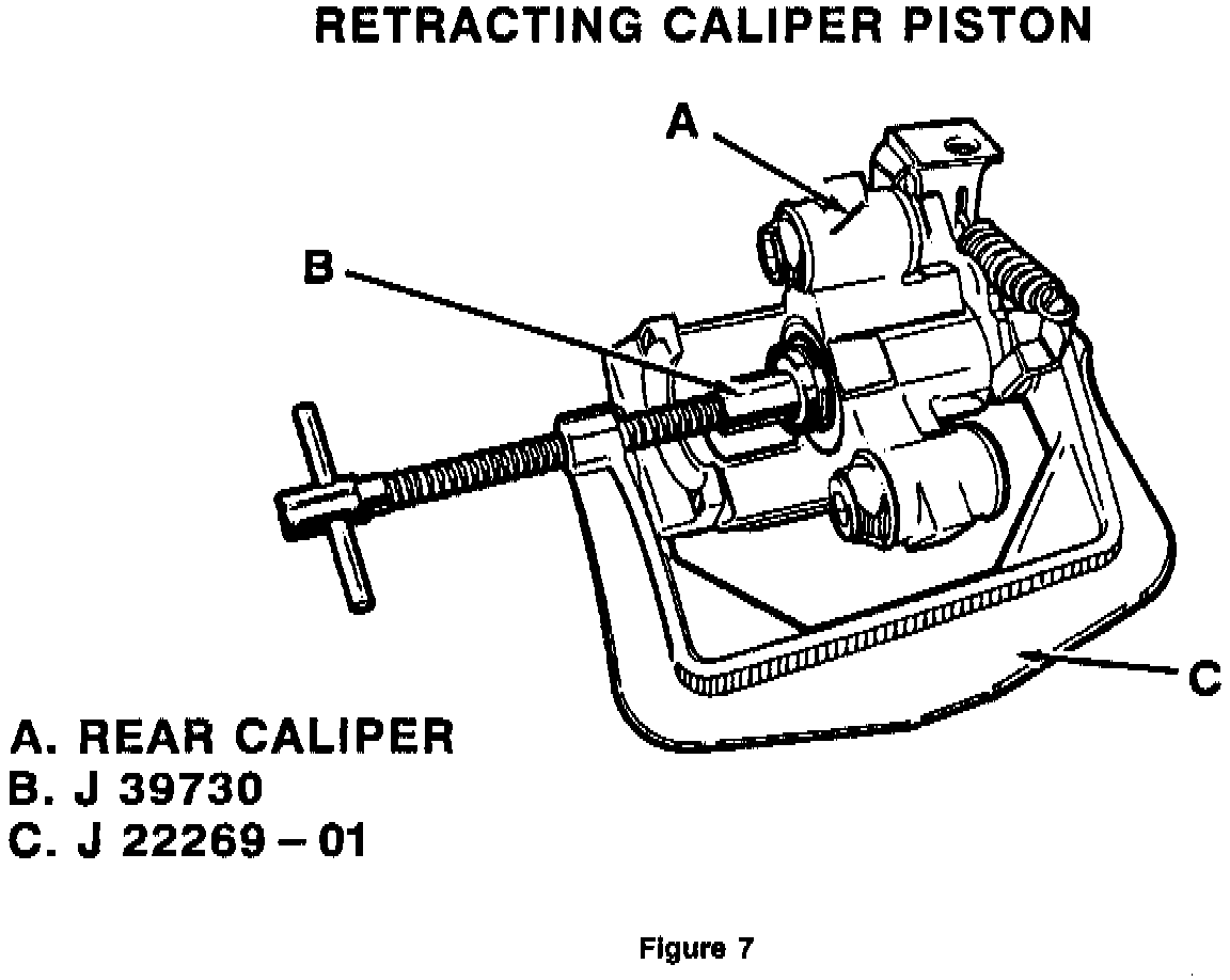 17. Retract caliper piston using the new Kent Moore Tool J-39730 attached to Kent Moore Tool J-22269-01. After retraction, make sure the grooves in the end of the piston are lined up in a vertical position to accept the inner pad retainer (See Figure 7 and 8).